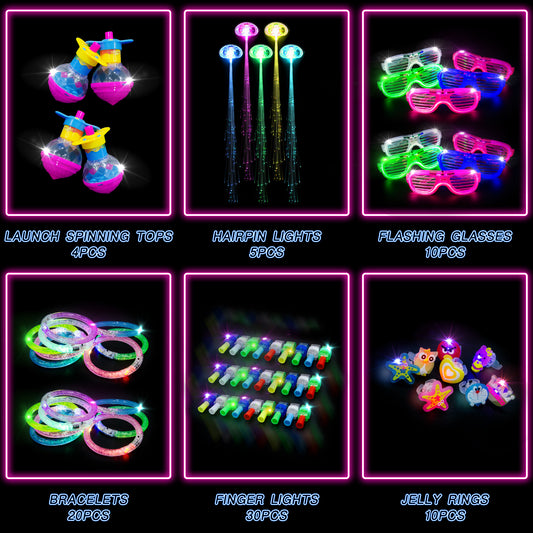 79pcs Flashing LED Party Supplies Set- Bracelets, Finger Light, Glasses, Hairpin Light, Jelly Rings, Spinning Tops